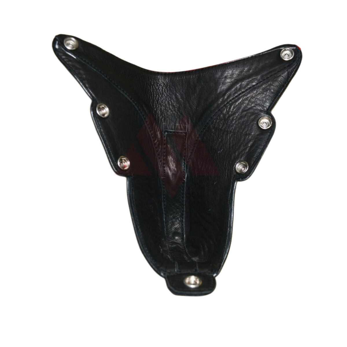 This premium men’s leather jockstrap showcases expert craftsmanship with its innovative multi-panel construction. The eye-catching red leather front pouch provides excellent support and coverage, while the sleek black side panels with strategically placed snap buttons ensure easy wear and removal. The brown leather center panel adds depth and character to the overall design. The circular cutout detail in the back panel offers both ventilation and aesthetic appeal, while durable elastic leg straps with leather reinforcement points ensure a secure, comfortable fit.