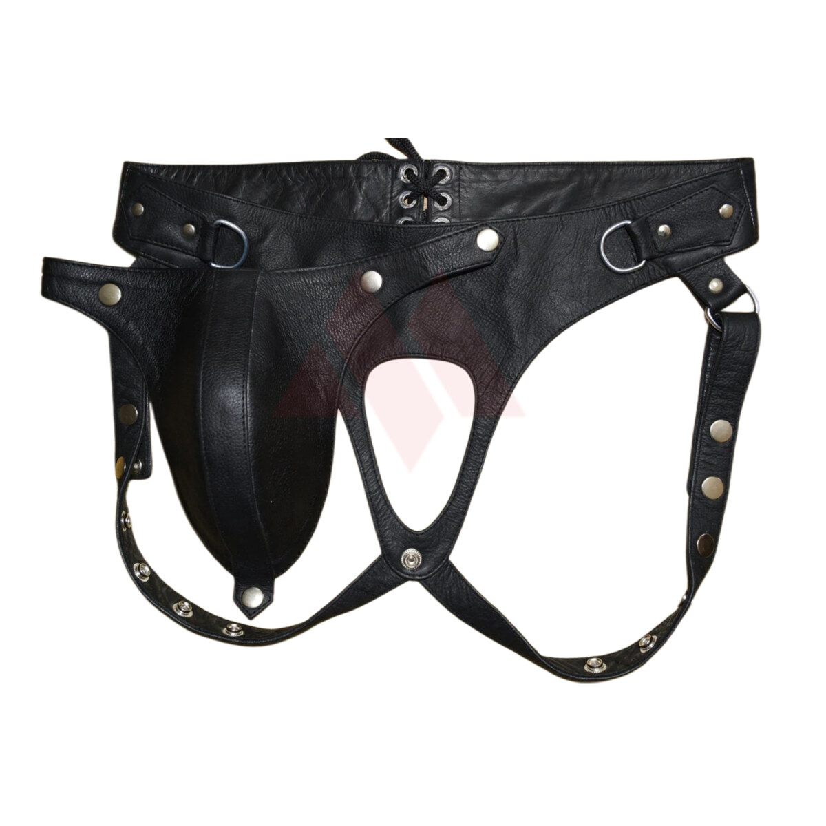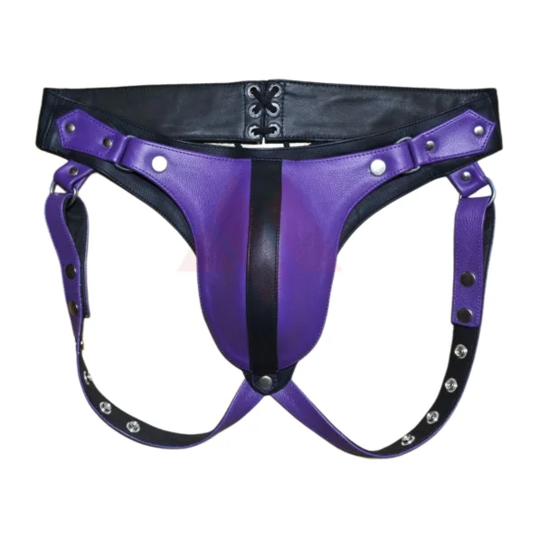 The centerpiece of this premium leather harness underwear is its sculptured pouch, expertly shaped in luxurious purple leather with a contrasting black center strip for enhanced dimension. What sets this design apart is the eye-catching corset lacing at the waistband’s front, threaded through reinforced metal eyelets to create both adjustability and visual drama.