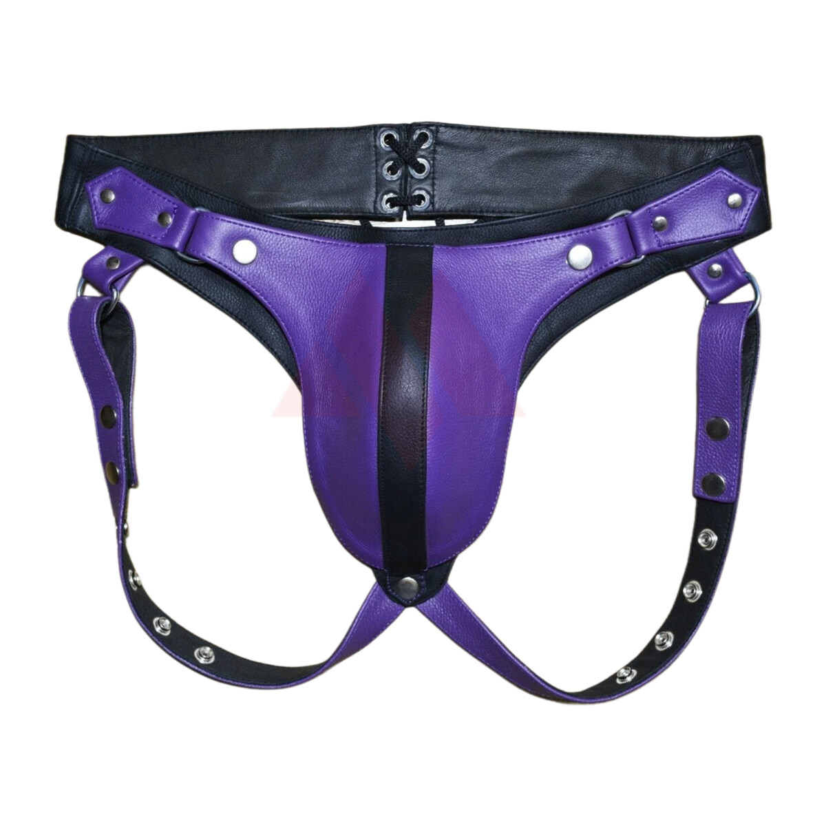 Unleash your confidence with this extraordinary Men’s Leather Pouch Underwear exclusively from Mr Leather Shop. Featuring a captivating fusion of rich purple and sleek black leather, this daring piece redefines intimate apparel with its distinctive harness-inspired construction and meticulous attention to detail.