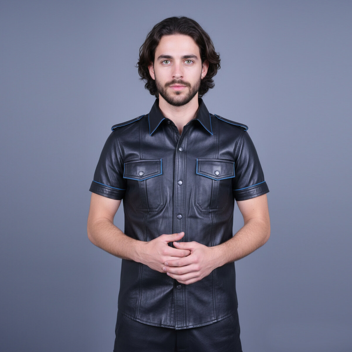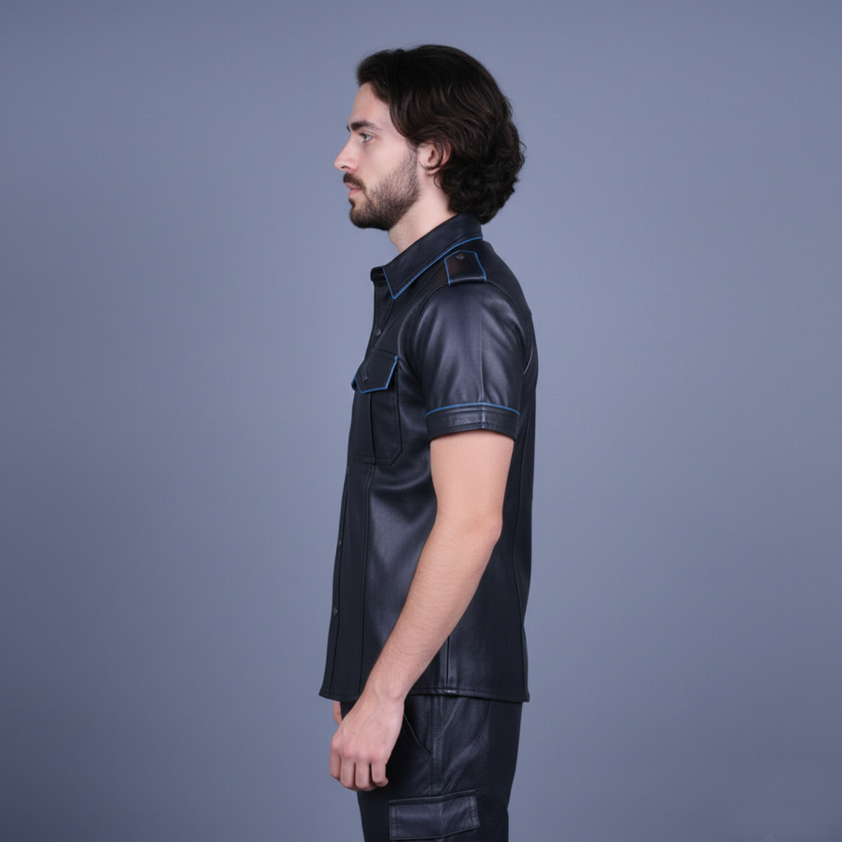 Step into commanding style with our Blue Piping Leather Shirt, a modern reinvention of classic leather apparel. Designed for men who demand confidence, durability, and distinction, this short-sleeved shirt is handcrafted from premium black faux leather and elevated with striking blue piping details that set it apart from ordinary designs.