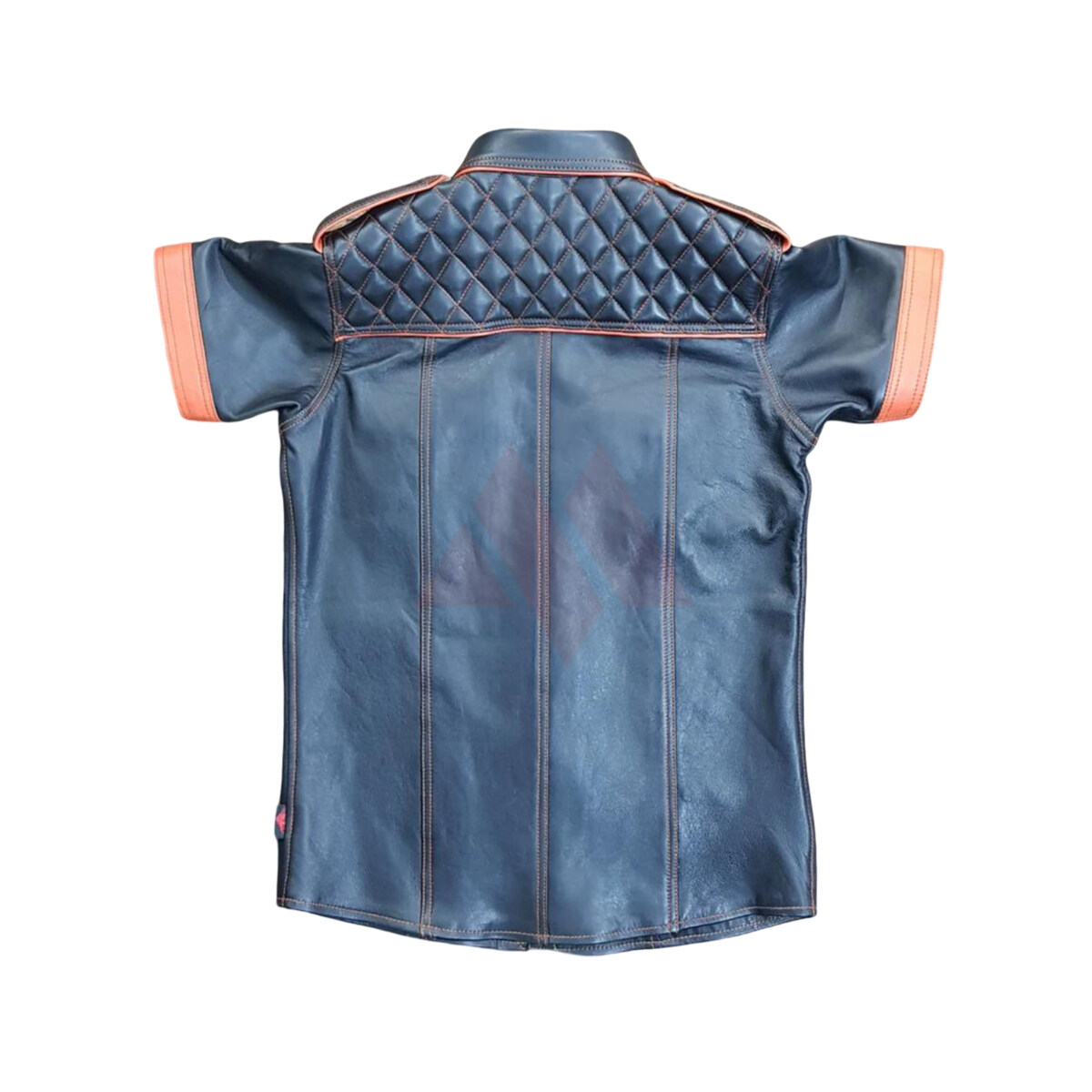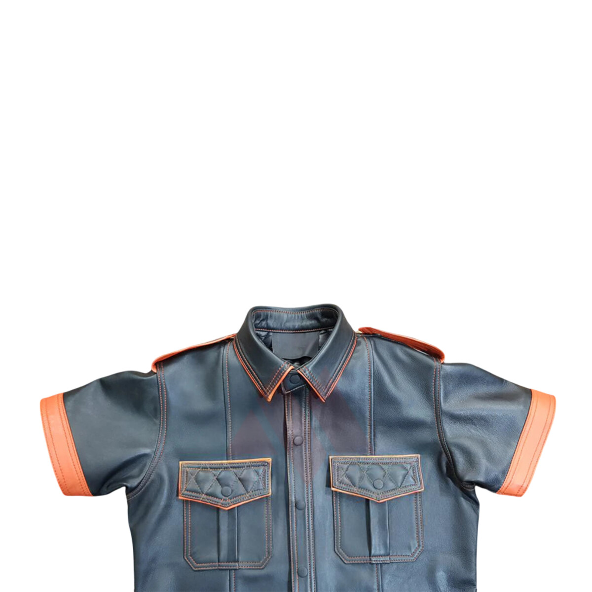 Our half sleeve leather shirt features meticulous attention to detail that sets it apart. Furthermore, the striking blue leather body beautifully showcases contrasting red piping that runs along the collar, shoulders, sleeves, and pocket edges, creating a bold visual statement. Additionally, the coral-toned sleeve cuffs and shoulder epaulettes add a sophisticated touch that elevates this piece beyond ordinary leather shirts.