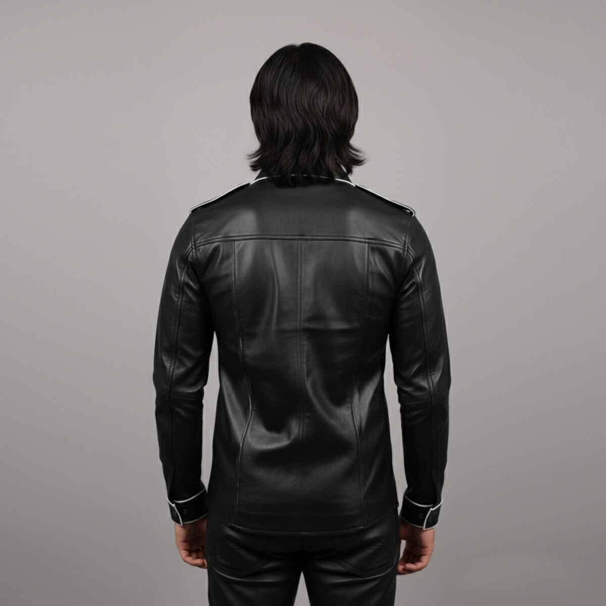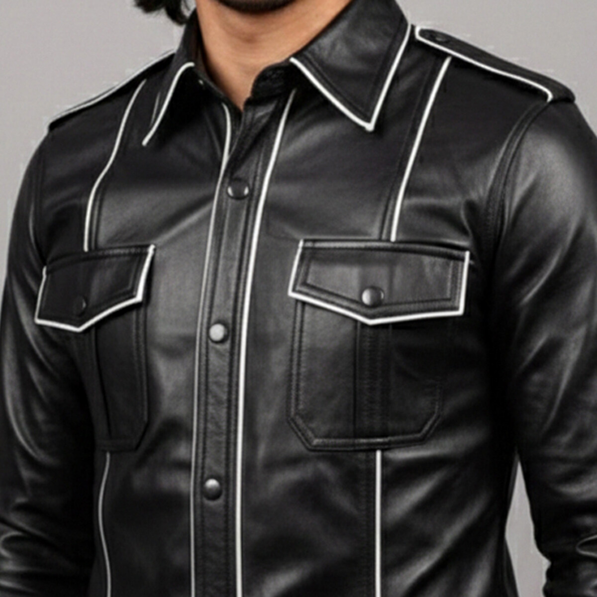 Unlike ordinary leather shirts, this piece features striking white piping accents that contour the seams, collar, cuffs, and chest pockets—creating a sharp contrast against the deep black leather. The result is a commanding silhouette that balances rugged masculinity with refined sophistication.