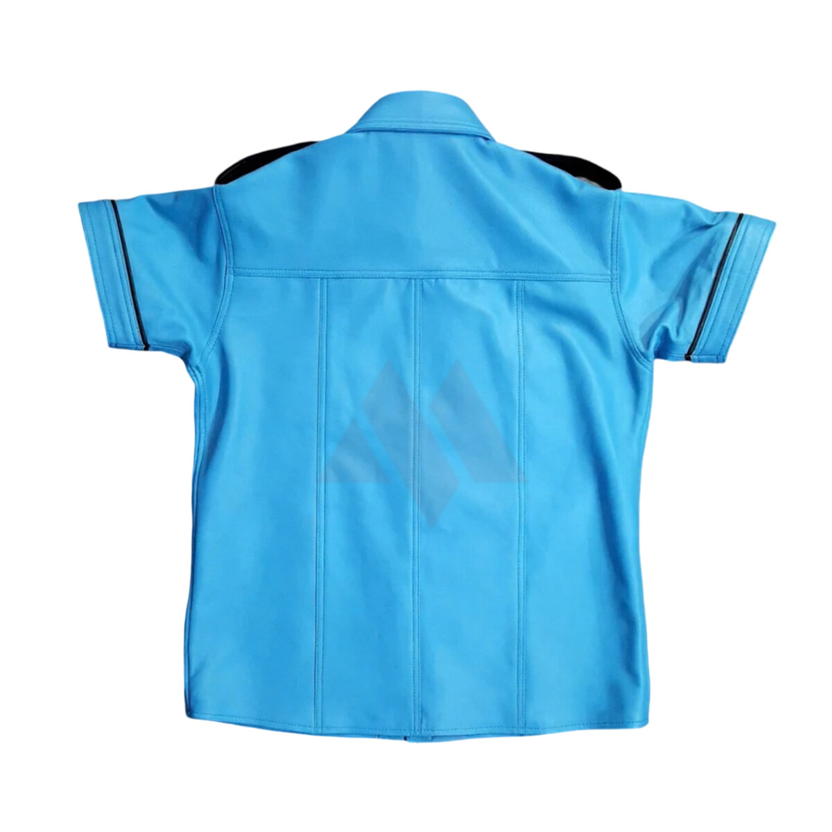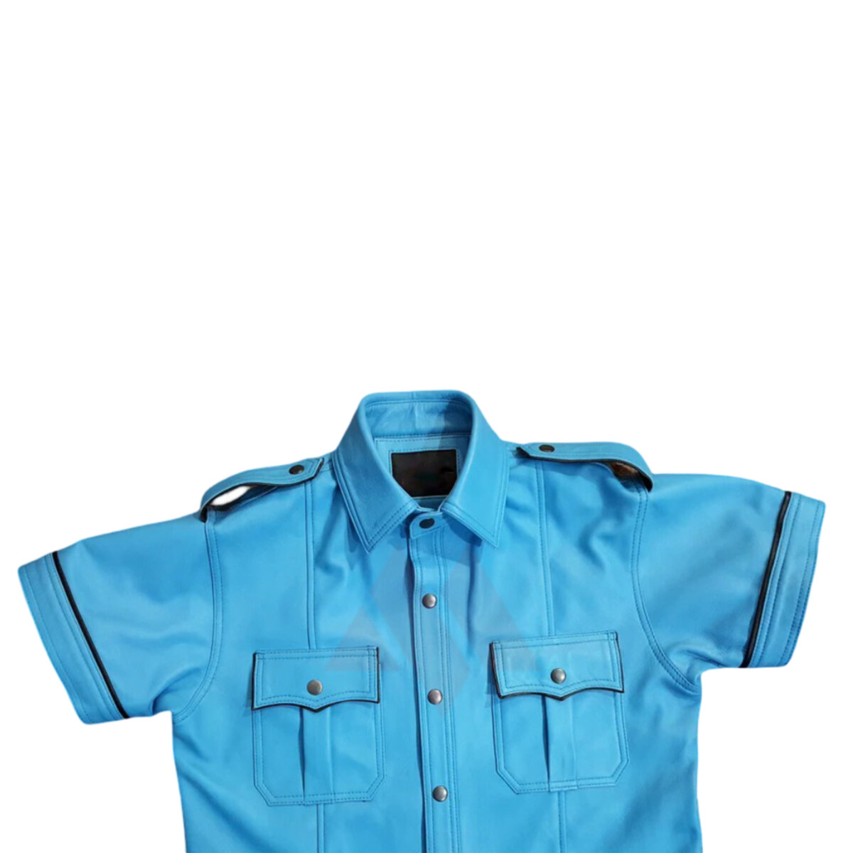 Elevate your wardrobe with this stunning male leather shirt from Mr Leather Shop a perfect blend of classic military-inspired design and contemporary fashion sensibility. This eye-catching turquoise blue leather shirt represents the pinnacle of custom leather craftsmanship, specifically designed for men who refuse to compromise on style or quality.