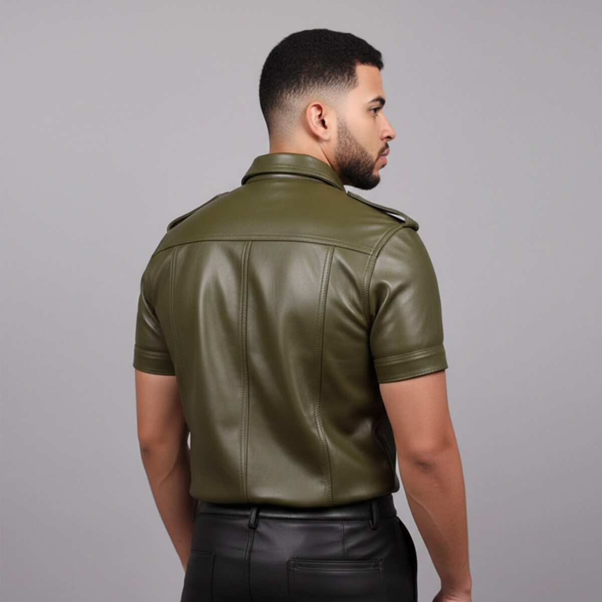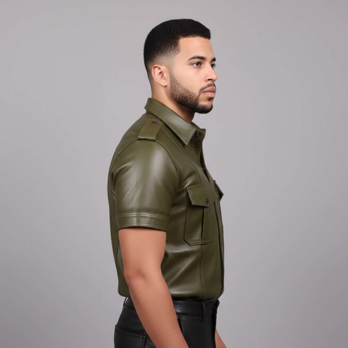 Step into commanding style with our Olive Green Leather Shirt, a striking evolution of classic military-inspired fashion. Crafted from premium genuine leather, this short-sleeve shirt delivers rugged durability while exuding confidence and sophistication. Its structured seams, glossy finish, and sharp silhouette make it a standout piece for men who demand more than ordinary apparel.