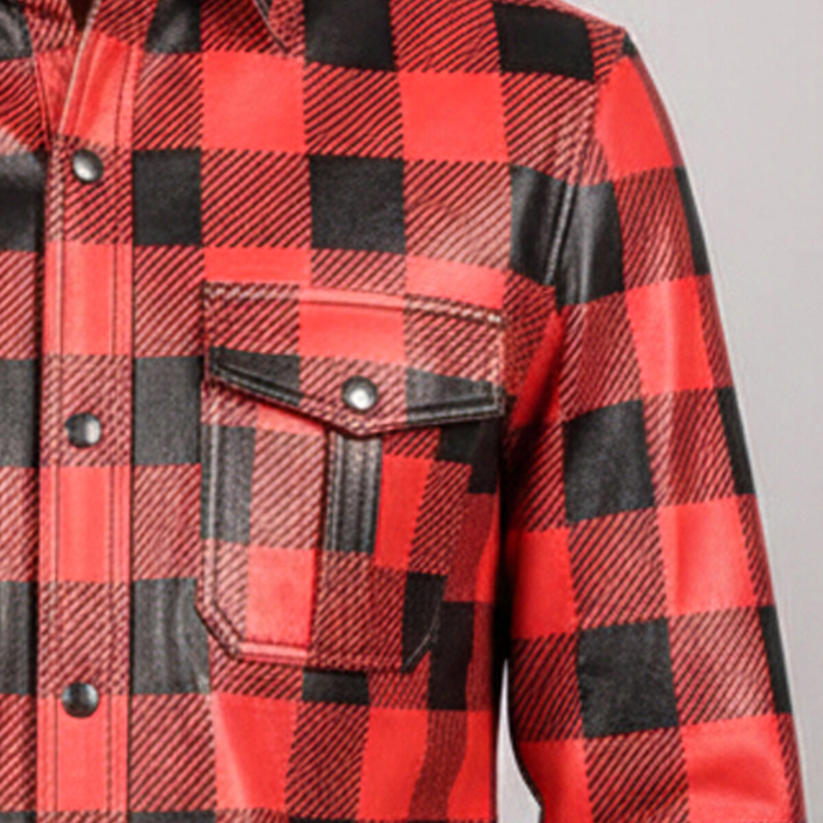- Plaid Reinvented – Traditional red-and-black check pattern reimagined in leather for a striking, unconventional twist.
