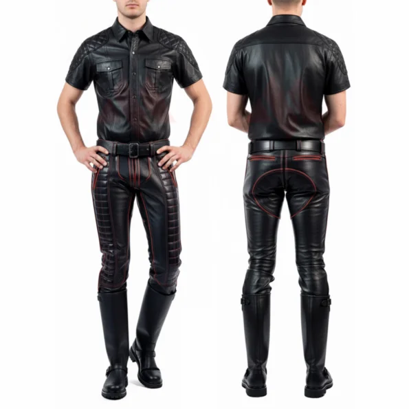This striking leather Uniform men set creates an unmistakable statement. The bold purple leather shirt combined with classic black quilted pants features luxurious golden piping and stitching that ties the ensemble together while providing striking visual contrast. The Western-style yoke harmonizes perfectly with the quilted knee panels, delivering an authentic, head-turning look that works for motorcycle clubs, Western events, rodeos, festivals, or daily fashion statements.